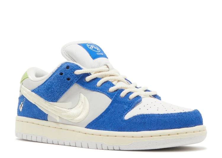 Crafted in partnership with the Shanghai-based skate shop, the Fly Streetwear x Nike Dunk Low Pro SB is an homage to the past. Inspired by the white jade orchid flowers sold on the streets of Shanghai, rope laces secure the white leather upper, contrasted by blue suede overlays (inspired by cloth that line the baskets to make the flowers more eye-catching) and a Nike-branded heel tab in lime green suede (representing the flower's stalks). A jade orchid earring graphic on the lateral heel is complemented by a flowery embroidered Swoosh. Padded tongues are embellished with mismatched woven tags marked with Fly Streetwear and Nike SB branding. The low-top is mounted on a rubber cupsole, featuring vintage off-white sidewalls and a white rubber outsole.