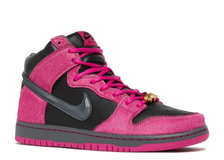 The Run The Jewels x Nike Dunk High SB ‘4/20’ pays tribute to the influential hip-hop duo formed by El-P and Killer Mike. Their dynamic sound is reflected in the shoe’s contrasting colors and textures, highlighted by a black tumbled leather upper with pony-hair overlays in a bold shade of fuchsia. The black signature Swoosh features a sculpted and polished exterior, while lace dubrae shine in metallic gold. Hidden details include a ‘Run The Jewels’ print inscribed on the inside of each collar flap and a stash pocket on the interior tongue. The high-top is mounted on a rubber cupsole that pairs black sidewalls with a fuchsia outsole.