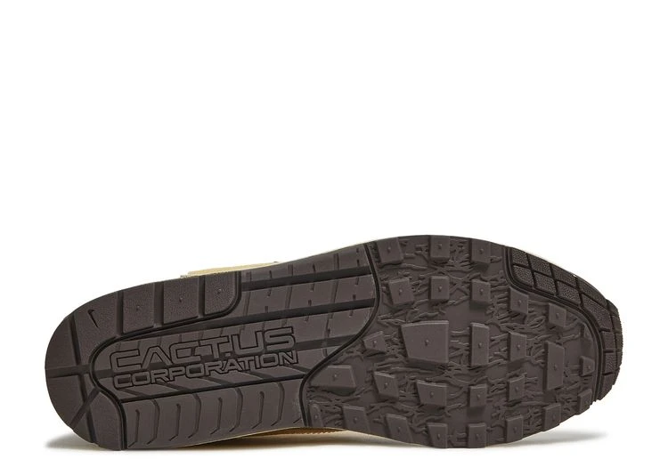 The Travis Scott x Nike Air Max 1 ‘Baroque Brown’ treats the iconic retro runner to a rugged outdoor-inspired makeover. Red hiker-style laces secure a cream-colored mesh upper with dark tan leather overlays and a brown nubuck mudguard. Scott’s signature reverse Swoosh decorates the lateral quarter panel in a Lemon Drop finish, while multicolor woven straps are integrated into the laces and heel overlay. The latter features a crimson triangular patch, accented with Cactus Jack branding on the right shoe and a classic Nike logo on the left. The sneaker is mounted on a two-tone foam midsole, fitted with Air-sole cushioning in the heel and supported by a waffle-traction rubber outsole.